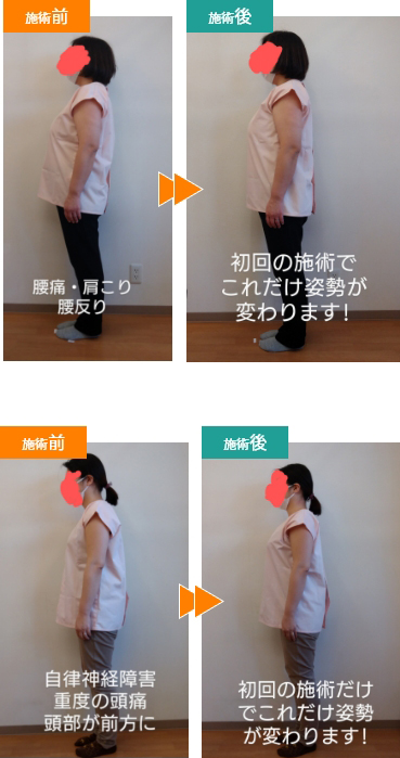 その後、通うごとに姿勢が良くなり、腰痛、肩こりが改善し、身体が軽くなる事を実感しています。現在もメンテナンス通院中です。