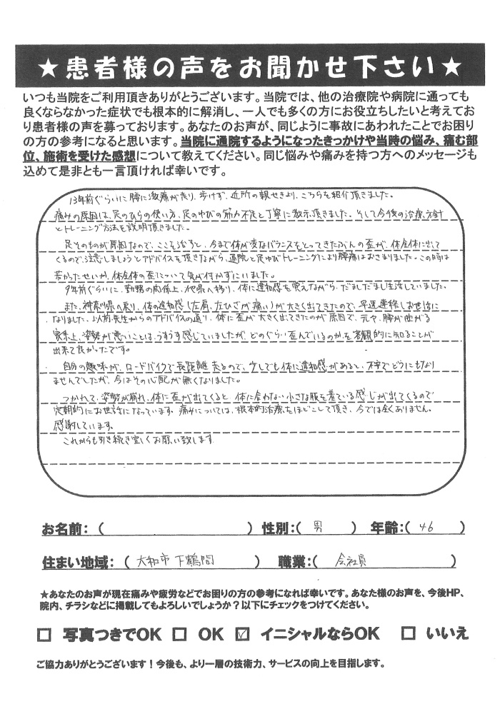 13年前位に腰に激痛が走り歩けず、近所の親戚よりこちらを紹介頂きました。