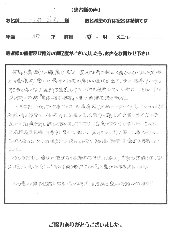 仕事中に背中に激しい痛み。数回目の施術で症状が改善されました。(F.M様 女性)